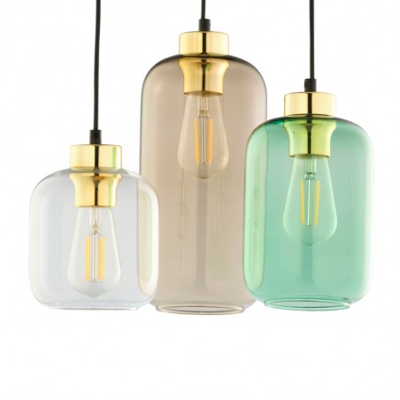 Deckenleuchte mit Lampenschirmen aus geblasenem Glas Flota. Moderne Hängelampe, die aus drei Glasschirmen besteht, von denen jeder eine andere Oberfläche und Größe hat. Der Stil dieser Deckenleuchte ist ideal für die Beleuchtung eines Wohnzimmers, eines Esszimmers oder einer Küche mit Originalholz.